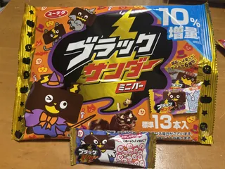 ブラックサンダーミニバー🍫⚡️ ブラックサンダーミニバーハロウィンを買いました。今回は標準13本入に対して13本でした。過去に一回だけ標準本数より一本多く入ってた事がありました😊重量管理で同じ重量でも13本より14本入ってた方がお得感を感じます👍